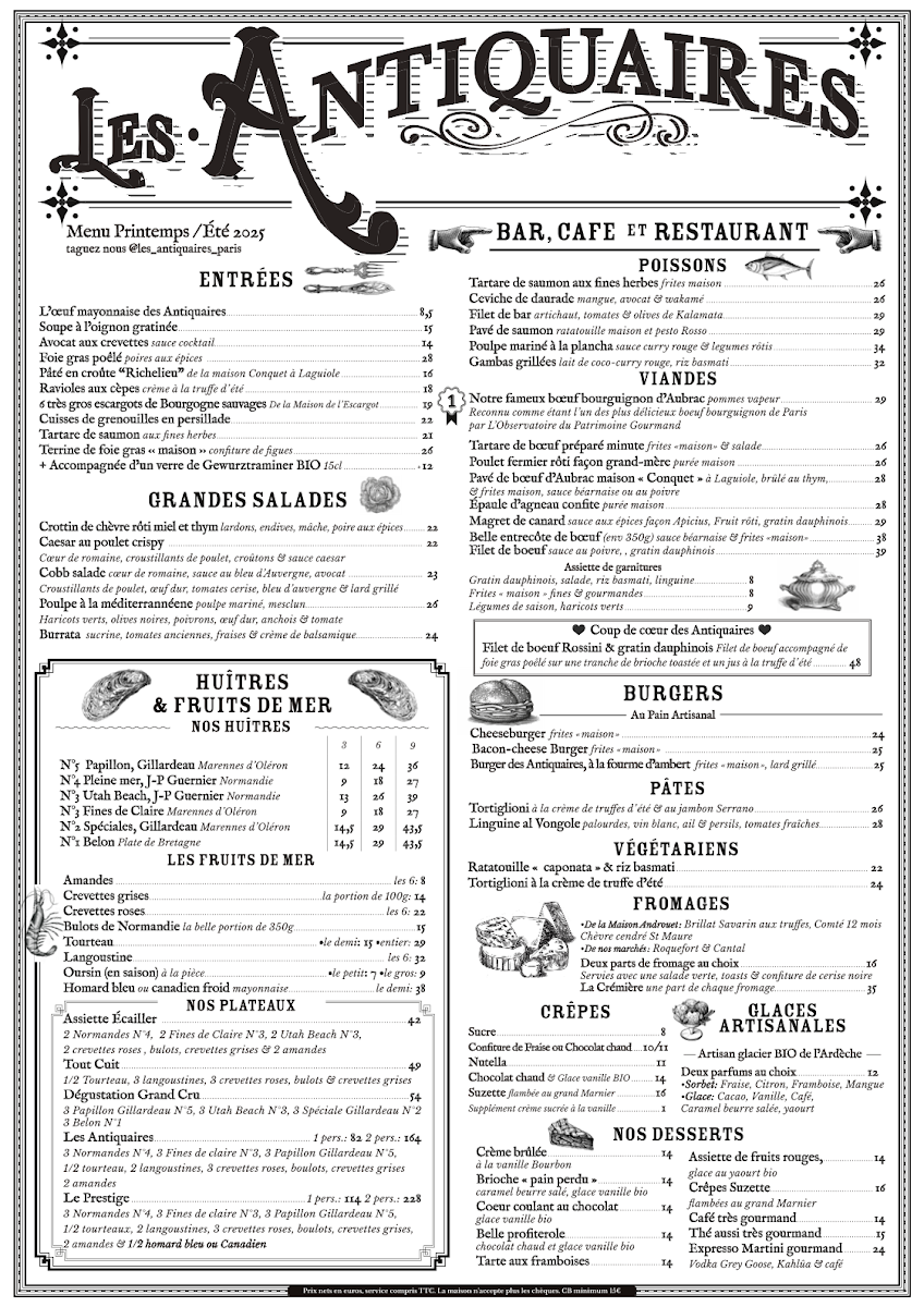 Nestled in the heart of Paris at 13 Rue du Bac, Les Antiquaires bistro is a captivating blend of traditional French fare and modern charm. This hidden gem offers an inviting atmosphere, perfect for indulging in a quintessential Parisian dining experience. Whether you’re looking for a delightful meal or a cozy spot to unwind, Les Antiquaires has it all.